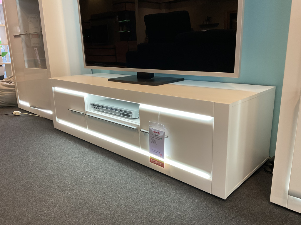 Korpus: WeissFront: Weiss HochglanzGriffe: Metall alufarbig1 Schubkasten / 2 Türen inkl. LED-BeleuchtungB/H/T: ca. 158 x 44 x 52 cm